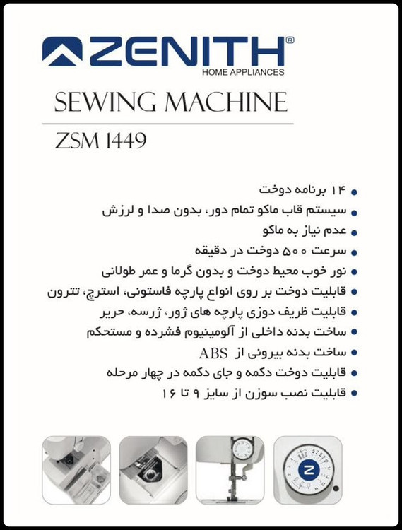 چرخ خیاطی زنیت مدل 1449 چرخ خیاطی با 14 برنامه دوخت است که قابلیت دوخت بر روی انواع پارچه فاستونی، استرچ، تترون داشته و قابلیت ظریف دوزی پارچه های ژور، ژرسه، حریر را دارد.