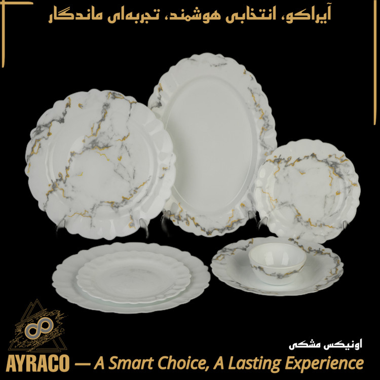 طراحی قالب گرد با لبههای پیچدار، ظاهری خاص و شیک به میز غذا میبخشد. این سرویس ۶ نفره از جنس آرکوپال با مقاومت بالا در برابر حرارت و ضربه تولید شده و کاملاً با نیازهای خانواده ایرانی سازگار است.