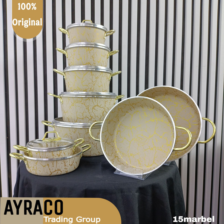 سرویس قابلمه ۱۵ پارچه گرانیتی طرح ماربل کرم طلایی مدل گلدونی – برند کوشا