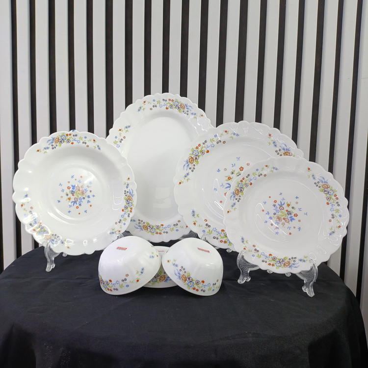 اقلام داخل سرویس شامل ۶ عدد بشقاب پلوخوری، ۶ عدد بشقاب خورشتخوری، ۶ عدد پیشدستی، ۶ عدد پیاله کوچک (مناسب برای ماست یا ترشی) و ۱ عدد دیس پلوخوری بزرگ است. این ترکیب کامل، نیاز خانوادهها را برای استفادهی روزمره یا پذیراییهای ساده برطرف میکند.