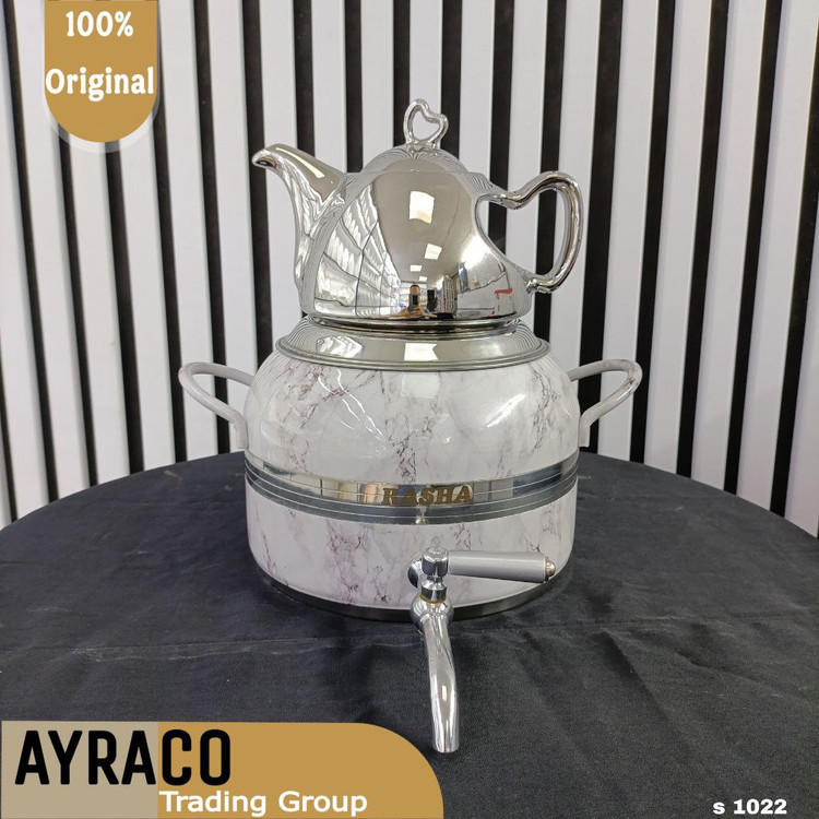 ست کتری و قوری راشا با طراحی چشمنواز و کیفیت بالای متریال، نهتنها یک ابزار دمآوری چای بلکه یک المان دکوراتیو برای آشپزخانه است. ترکیب رنگهای خاص مانند طلایی و مشکی جلوهای لوکس به فضای آشپزخانه میدهد، درحالیکه استیل باکیفیت آن تضمینکننده عمر طولانی و درخشندگی ماندگار است.