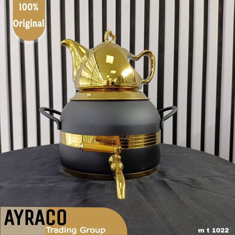 ست کتری و قوری راشا با طراحی چشمنواز و کیفیت بالای متریال، نهتنها یک ابزار دمآوری چای بلکه یک المان دکوراتیو برای آشپزخانه است. ترکیب رنگهای خاص مانند طلایی و مشکی جلوهای لوکس به فضای آشپزخانه میدهد، درحالیکه استیل باکیفیت آن تضمینکننده عمر طولانی و درخشندگی ماندگار است.