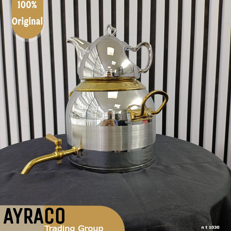 ست کتری و قوری راشا با طراحی چشمنواز و کیفیت بالای متریال، نهتنها یک ابزار دمآوری چای بلکه یک المان دکوراتیو برای آشپزخانه است. ترکیب رنگهای خاص مانند طلایی و مشکی جلوهای لوکس به فضای آشپزخانه میدهد، درحالیکه استیل باکیفیت آن تضمینکننده عمر طولانی و درخشندگی ماندگار است.