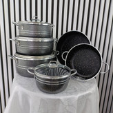 سرویس ۱۰ پارچه اپیروس با ترکیب سه قابلمه در سایزهای ۲۰، ۲۴ و ۲۸ بههمراه یک تابه ۲۸، یک مجموعه کمحجم اما فوقالعاده کاربردی برای هر آشپزخانه به حساب میآید.