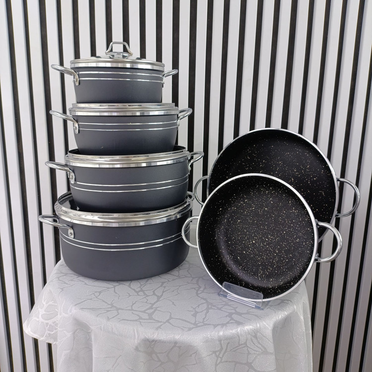 سرویس ۱۰ پارچه قابلمه اپیروس مشکی گرانیتی – مجموعه حرفهای قابلمه و تابه در سایزهای بزرگ و کاربردی