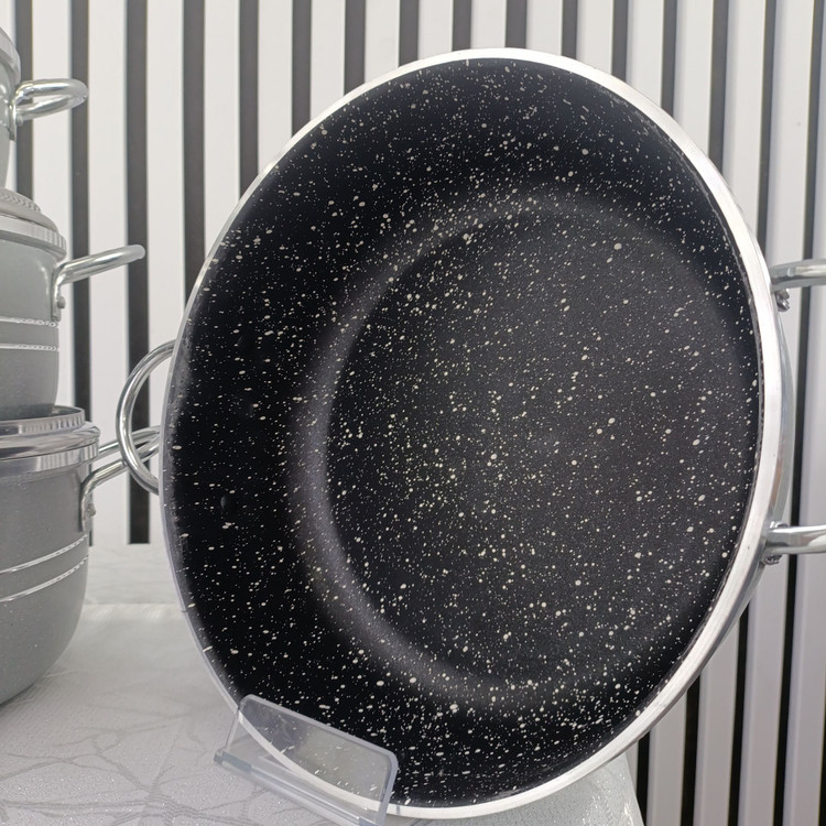 پوشش داخلی ظروف از جنس نچسب مقاوم چندلایه بوده که مانع چسبیدن غذا میشود و شستوشوی ظروف را بسیار سریع و آسان میسازد. بدنه مستحکم، انتقال یکنواخت حرارت و طراحی استاندارد دستهها باعث عملکرد بهتر، سرعت پخت بالاتر و امنیت در هنگام استفاده میشود.