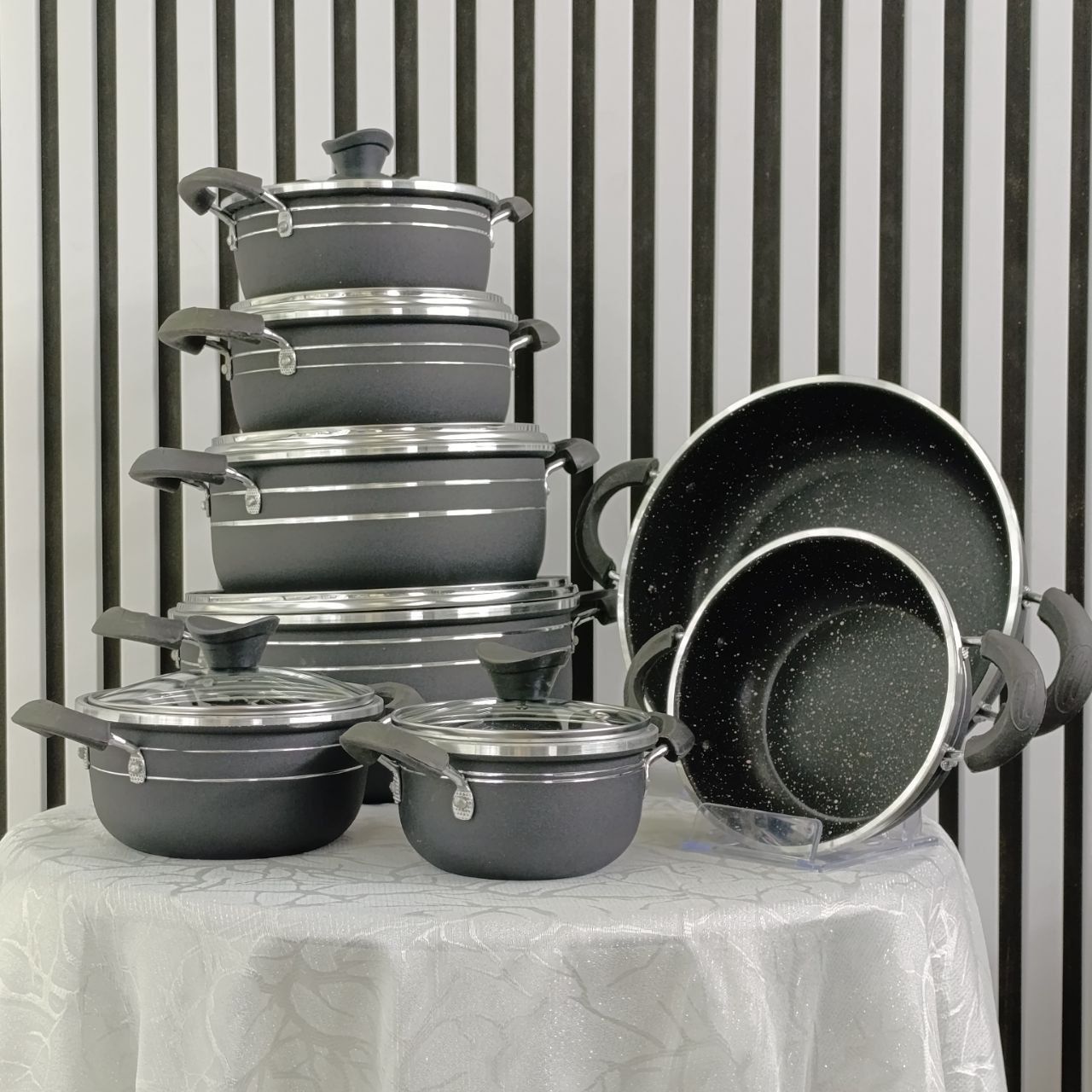 سرویس در این مجموعه از مواد اولیه مرغوب و پوشش نچسب استاندارد ساخته شده که امکان پخت انواع غذاها را بدون چسبندگی و با حداقل روغن فراهم میکند. دربهای شیشهای مقاوم با قاب فلزی، دید کامل از داخل قابلمه را ممکن ساخته و شما را از باز کردن مکرر بینیاز میکند. دستگیرههای ارگونومیک با پوشش ضدگرما، ایمنی و راحتی را در هنگام جابجایی ظروف تضمین میکنند.