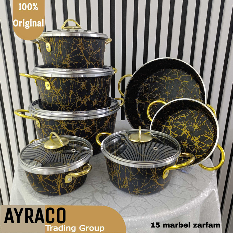 سرویس قابلمه 14 پارچه ماربل زرفام رنگ مشکی و طلایی | قابلمههای حرفهای آشپزخانه