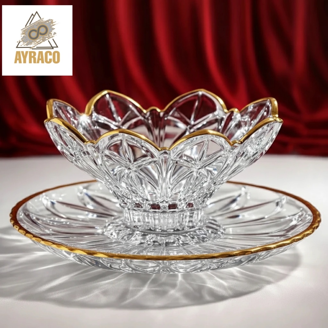 طلای کارشده روی لبه ظروف باکیفیت بالا و مقاوم در برابر شستوشوی صحیح است و در کنار شفافیت عالی بلور، ترکیبی چشمنواز ایجاد میکند. از فنجان و پیشدستی تا آجیلخوری و شکلاتخوری—all you need for hosting—همه اقلام لازم برای یک پذیرایی کامل و شیک در این ست قرار گرفته است.